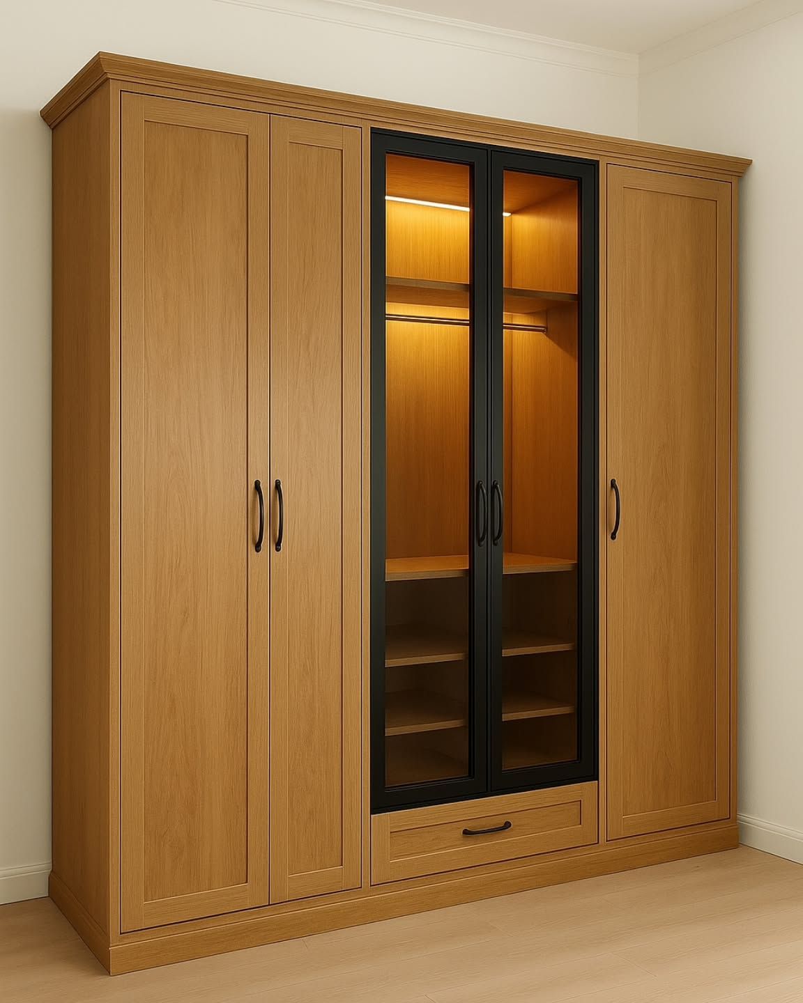 يجمع بين متانة الألمنيوم وجمال الخشب، هيكل خارجي معدني قوي مع واجهات خشبية فاخرة عصرية.